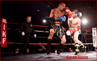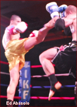 In today's environment of Mixed Martial Arts, Muay Thai Kickboxing has taken a back seat in hopes that it will one day be thrust into the spotlight along with other high profiled contact sports. Techniques used in Muay Thai / Kickboxing - Boxing, kicks, knees and elbows are in many cases what makes MMA the popular sport it is today. In a general discussion with most MMA fans, they love the stand up part of this sport more than anything. What that says about the sport of Muay Thai / Kickboxing is not only that it is a viable sport but is only a few steps away from being back in the spotlight. (Abasolo pictured left landing elbow on opponent)