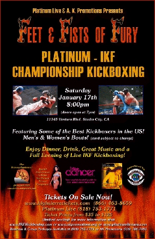 The next show would land in beautiful Hollywood...Studio City, CA to be exact! The home of many stars and a huge history especially being the home of mega media giant CBS. Davis worked out a promotional deal with Platinum Live Supper Club owner David Sebag. Sebag's popular club had once hosted such great acts as the Beetles as well as played host to star-studded after parties for the popular Grammy Awards. Sebag and Davis spoke briefly about potentially promoting special shows in Las Vegas, NV, the site of their initial meeting. The shows would have great music and dance entertainment combined with exciting Kickboxing fights. It was only a matter of selling the concepts to casino owners. Although several attempts were made, the package was never accepted, they moved on and decided to try a show at Sebag's Supper Club. The club was fully equipped with lighting and sound that gave the shows that Hollywood appeal!