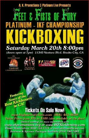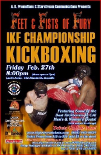 One of two shows, the first event came off well as fight fans not only got a chance to see kickboxing and many for the first time, but also witnessed some of the best local singing and dancing talent Hollywood had to offer. The event featured a great main event with Robert Tubuso of Daly City, CA pitted against Robert Elledge of Roseville, CA who by the way, finally got his chance to fight coming off the cancellation of the first show's bout late in 2003. This win would give him the IKF California West Coast Super Lightweight title in an exciting main event!