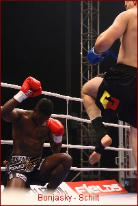 This one lasted scarcely two minutes, as Schilt took the initiative from the bell, pumping in punches, kicks and knees while Bonjasky remained on the ropes, closed up in defense. Schilt's power got him through the defenses easily enough, and after a left knee to Bonjasky's head left the Champion badly shaken, Schilt followed up with punches and a hard front kick to score a down. Only 30 seconds after resumption, it was a knee to the abdomen that felled Bonjasky for a second time, ending the bout and putting Schilt through to the final.