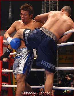 The two were tentative from the start and the first round was about even -- a technical fight with the two kickers predictably trading kicks, neither able to dominate. But suddenly, just seconds from the bell, Feitosa surprised Musashi with a quick right straight punch to the kisser, and scored a down.