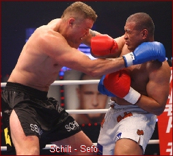 In the second Schilt had low kicks working well, and although Sefo made some contact with a dandy spinning back punch and a right overhand, he was rattled badly when Schilt followed a left high kick with a straight punch. By the start of the third Sefo was bloodied and all but beaten, but to his credit Sugarfoot kept calling Schilt in, hoping against hope that he might get a hook round and in to score a down. But Schilt was in control, with all manner of kick and punch attacks. Sefo took a standing eight near the end of this one, which went to Schilt by unanimous decision.
