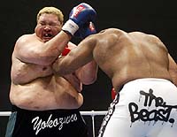 "The Beast" threw some nice low kicks, and when a fatigued Akebono relaxed his guard, got a solid left punch through that stunned the Sumo wrestler. It was a right hook that sent Akebono to the canvas for the first down. But to his credit, Akebono struggled to his feet to beat the count.