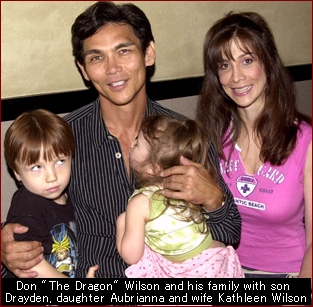 The license plate on his Mercedes reads 1 DRAGUN. A ceramic dragon sits atop a TV set in his home. White Dragon, a style of kickboxing, gave Don ''The Dragon'' Wilson his nickname and made him an 11 time Kickboxing World Champion. But his athletic career didn't bring him the Benz. Breathing white-hot fire at the video store did. With over 30 martial-arts movies under his belt-including his upcoming movie, The Last Sentinel, Wilson is a small-screen superstar. ''I'm at the top of the bottom,'' he says, smiling. The Japanese-American Florida native stands a lean six feet, 190 pounds-not the overpumped body you might expect of a lethal weapon. Combine that physique with boyish handsomeness, at 52 he looks 30, and it adds up to a strange kind of action hero. ''(In my movies) I'm the good guy. I don't drink, smoke, swear, do drugs, and I don't have explicit sex scenes,'' he says. ''Parents know, when they rent my movies, that there are good guys and bad guys, and the bad guys lose.'' This, he believes, is the reason the average height of fans at his autograph signings is four feet. ''These films tend to be followed by a specific, loyal audience that we can access directly through video,'' says Mike Elliott, who, as production head of schlockmeister Roger Corman's Concorde Pictures, has overseen Wilson's Bloodfist movies. ''(Concorde puts) out 30 pictures a year, but Don's films alone could keep the company running in profits.'' In 1987, Corman discovered Wilson in a karate magazine and gave him a call. ''I read for Roger,'' Wilson remembers. ''He sat back, stared at me, and said, 'You're gonna be a big movie star.' '' Two days later, Wilson signed a deal and began working for scale (about $1,200 a week). In 1994, Wilson earned well over $1 million and you can multiply that quite a few times for what he makes today. As well as acting in his films, Don has co-produced over 20 of his films. He has mutual approval over almost every creative aspect of film making. Things weren't always so, well, kicky. Wilson arrived in L.A. in 1985, pulled into a Holiday Inn, and spent a month reading books about acting. Hollywood, however, was unimpressed. ''There's not much call for six-foot Asian actors with Southern accents,'' says Wilson. One La Choy Chinese-food commercial and one stint as Thug No. 1 on General Hospital later, Wilson met his video destiny. The actor has mixed feelings when he's referred to as the next Jean-Claude Van Damme. He'd love to follow in the Belgian's big-screen footsteps. But in the ring, forget it. ''He was a member of the Belgian national team. That's like being part of the Bahamian football league,'' explains Wilson. ''If we boxed, it would be like Stallone fighting Tyson.'' Wilson of course would be the Tyson.... Re-Enter the Dragon Over his career Wilson fought and defeated many Great fighters such as James Warring, Demetrius Edwards, Maurice Smith, Dennis Downey, Dennis Alexio, Branimir Cikatic, Mike Winkeljohn, Herb Thompson, Greg Smith, Muhammed Ashraf Tai, Panya Sornnoi, Pongdienoi Prasobchai, Rob Salazar, and a very controversial Draw against Jean-Yves Theriault which many thought Wilson clearly won. Don's fight record was 71 wins, 5 losses with 47 knockouts along with winning 14 titles. Here is a breakdown of his accomplishments as a fighter.