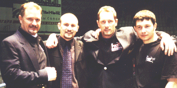 Last Saturday night, February 3rd, the IKF made it's debut in Omsk, Siberia Russia as Promoter Oleg Vadaturskiy brought together Englands Perry Ben and Russia's Vladimur Autamonov (Both Pictured Left in photo) to fight for the vacant IKF FCR Super Welterweight World title. Over 4,000 people watched Autamonov & Ben fight a full 12 rounds that was one of the most exciting World Title bouts ever with tremendous action from both fighters in each and every round. It wasn't the first IKF event in Russia and it surly won't be the last. The person who brought everyone together for the event and several meetings in regards to the growth of IKF in Europe was IKF Russian Representative Oleg Vadaturskiy. (Far right in photo) Vadaturskiy became a big part of the IKF last year after leaving another England based sanctioning body that many other representatives, fighters, trainers and promoters have left to join the IKF for many different reasons. While in Russia, IKF President Steve Fossum (In group photo on left) and IKF European Director Alby Bimpson (In group photo 2nd from right) agreed to combine forces with a large Russian National League of Kickboxing to form the IKF Russian National League of Kickboxing. Working together, the two organizations will help build up kickboxing in Russia and provide exposure for Russian fighters for bouts around the World. The IKF plans to do this for many more countries throughout Europe in 2001 as well as part of their 2001 Game Plan. IKF Promoter and Russian Representative Oleg Vadaturskiy (Below at right in photo) celebrates his fighter Vladimir Avtamonov (Red pants kicking Ben at right and below as awarded World Title Belt from IKF President Steve Fossum) unanimous decision World title victory after 12 Rounds against England's Perry Ben for the vacant FCR Super Welterweight WORLD Title. In a 12 round bout, the minimum required amount of kicks would be 12 x 8 = 96. However, Avtamonov threw over 160 kicks over 12 rounds while Ben threw over 120. There wasn't a round that these two fighters weren't going toe to toe. This was one of the most exciting World Title bouts ever by 2 GREAT FIGHTERS! The night also featured 2 IKF FCR Russian National Pro titles which were co sanctioned with the Russian National League. |